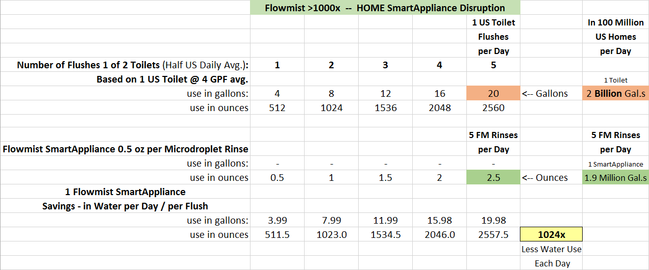 Use Flowmist Home SmartAppliances' >1000x Disruption and Save a Billion Gallons of Water a Day: Note that we've been contrasting above Flowmist's disruptive 0.5 oz microdroplet-rinsing with a best-selling 1.0 gpf building-urinal and the liquid-waste flush modes of newer 0.8-1.1 'dual-flush' appliances, not the conventional 3.5-6.0 gpf toilets that are installed in a significant majority of U.S. homes and businesses. In the U.S. market there are over 114 million occupied homes with an average of about two 3.5-6.0 gpf toilets per home each used five times a day. Using a 4.0 gpf rate as an 'average toilet' (see spreadsheet-excerpt above) just one of two 4.0 gpf toilets flushed five times takes 20 gallons of water each day. In 100 million homes that's two billion gallons of water a year--for one toilet. Thus, two 4.0 gpf toilets flushed five times a day (i.e., ten flushes) use 40 gallons per home/day--which comes to 14,600 gallons per home/year--that's four billion gallons, enough water to fill up an average size swimming pool at every U.S. home every year. Let's convert the one 4.0 GPF toilet used five times per day to ounces: the 20-gallons equals 2560 ounces of water. In contrast, the five use-cycles or microdroplet-rinsings per day of a Flowmist Home SmartAppliance come to 2.5 ounces of water use per day--a disruptive >1000x reduction in water use. So, using just one Flowmist 'FM' SmartAppliance as one of a home's two toilets could save 19.98 gallons of water per day, which means that if less than half of the U.S. homes used a FM SmartAppliance we could collectively save one billion gallons of water per day. Get the pay-for-themselves SmartAppliances into a 100 million homes, and still only use them for half the daily (10) flushes and they could even save two billion gallons of water a day just in U.S. homes. Businesses/commercial buildings use 9.5 billion gallons of water per day (2% of which = 190 million gallons). So wall-mount or Zero-Footprint Flowmist models employed in around 2% of U.S. businesses* would save over a billion gallons of water about every week (i.e., sixty-one billion gallons each year).